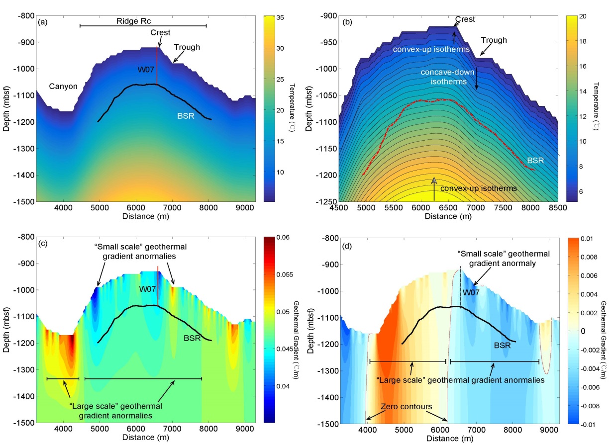 結(jié)合海底下溫度場的數(shù)值模擬分析結(jié)果分析認(rèn)為這是由地形起伏造成的。研究區(qū)內(nèi)兩種尺度的地形起伏影響水合物穩(wěn)定帶,分別是峽谷與脊交錯分布造成的地形起伏以及脊上溝槽與局部高點(diǎn)交錯分布造成的地形起伏。