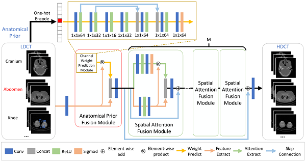 研究團隊針對現有基于深度學習的低劑量CT成像技術在訓練方式的不足,提出了一種基于解剖先驗信息的融合網絡,從訓練數據的DICOM文件中直接讀取其解剖部位標簽,并將其作為網絡的先驗信息進行編碼;再通過通道注意力技術,自適應的獲得不同解剖部位圖像在訓練網絡中的最優權重。另外,考慮到特征提取的多樣性,在網絡模型上采用多個級聯空間注意力模塊。新方法可以有效提高低劑量CT圖像的恢復效果。未來,課題組將探討全身低劑量CT成像技術的高效解剖信息融合機制,為低劑量掃描下的影像篩查提供重要技術支持。