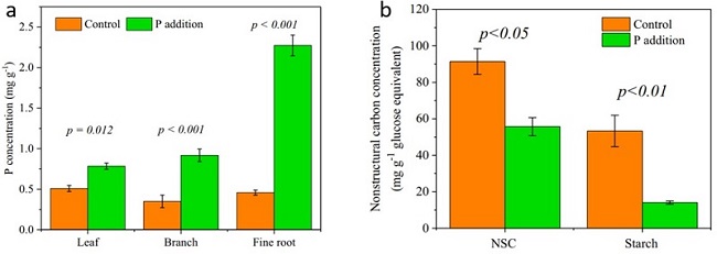 圖1. 長期磷添加增加植物組織磷濃度(a)并降低細根碳水化合物濃度(b)