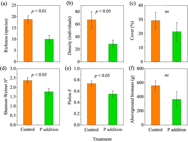 圖2. 長期磷添加降低林下層植物的豐富度和多樣性