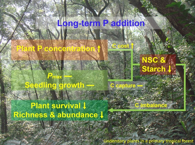 中科院華南植物園生態中心毛慶功助理研究員在魯顯楷研究員和莫江明研究員指導下,通過在南亞熱帶“富氮”的季風常綠闊葉林進行長期磷添加控制試驗研究發現:長期(2008-2017年)磷添加顯著增加了土壤總磷(1倍)和有效磷(>30倍)以及植物組織(細根、枝條、葉片)磷含量。但是,林下植物的最大凈光合速率和幼苗生長速率并沒有顯著增加。相反,長期磷添加處理顯著降低了種子萌發苗的存活率和林下植物多樣性(如物種數和個體數等)。進一步分析發現這種負面效應可能是與磷添加后植物體內非結構性碳消耗增加有關(如細根非結構性碳含量降低了30 %)。