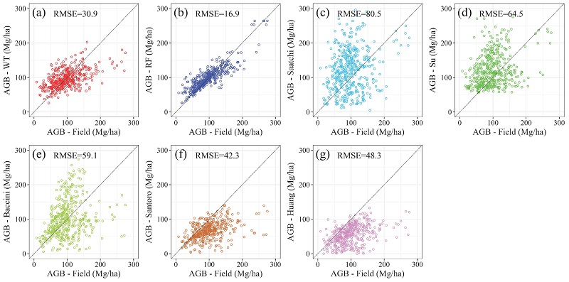 圖 3. 線性加權(quán)模型(a)和隨機(jī)森林模型(b)以及來(lái)源于Saatchi(c)、Su(d)、Baccini(e)、Santoro(f)和Huang(g)估算碳儲(chǔ)量與實(shí)測(cè)碳儲(chǔ)量對(duì)比。