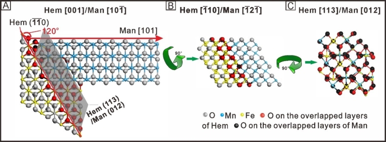 研究結果表明:(1)Mn(II)在赤鐵礦表面的氧化及成核生長具有明顯的晶面依賴性:SEM和TEM結果表明錳氧化物納米纖維僅在六方片狀赤鐵礦的邊面{113}生長,而無法在基面{001}生長;另一方面,偽立方狀赤鐵礦各個{012}面均能催化錳氧化物生長。(2)Mn(II)氧化的晶面依賴性與Mn(II)對{012}與{113}晶面的親和力高于{001},以及在赤鐵礦納米片上邊面{113}向基面{001}的體相電子轉移有關。(3)錳氧化物納米纖維主要為水錳礦(γ-MnOOH)和黑錳礦(Mn3O4),它們的生長機制包括黑錳礦的異相成核、顆粒聚集生長、黑錳礦向水錳礦轉化以及自催化氧化生長。(4)赤鐵礦可作為錳氧化物晶體的生長模板:錳氧化物納米纖維的延伸方向與赤鐵礦晶面呈特定角度;同時高分辨透射電鏡結果顯示赤鐵礦與錳氧化物可在三維方向上實現近乎完美的晶格匹配。該研究從原子尺度揭示了錳氧化物在赤鐵礦晶面的異相氧化生長的晶面特異性及電子傳遞機制,厘清了錳氧化物結晶生長的微觀機制,對認識礦物表面結構制約氧化/還原過程和晶體異相生長的機制具有重要啟示。