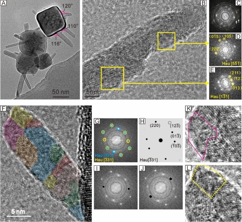 圖三: (A-L) 偽立方狀赤鐵礦表面生長錳氧化物的TEM圖及其對應FFT圖