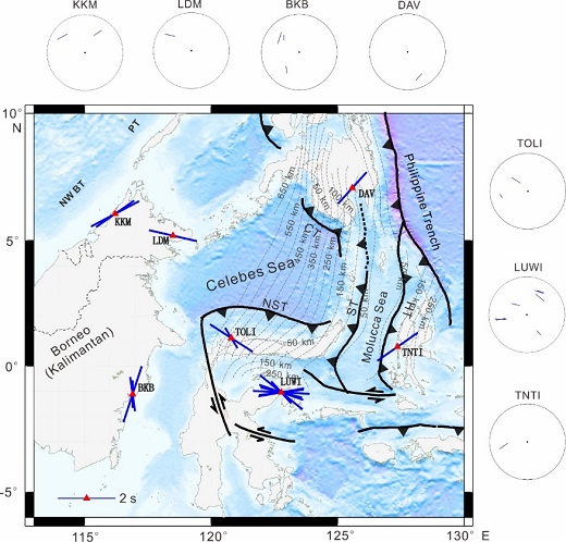 東南亞環蘇拉威西海地區,東鄰太平洋板塊,南鄰印度—澳大利亞板塊。該區長期受到西太平洋與特提斯構造域的影響,形成復雜的多俯沖系統(圖1),包括位于蘇拉威西海北東側的Cotabato(科托巴托)俯沖帶、南側的North Sulawesi(北蘇拉威西)俯沖帶,及東南側的雙向俯沖帶——Molucca Sea(摩鹿加海)板塊分別向西和東俯沖形成的Sangihe(桑義赫)和Halmahera(哈馬黑拉)俯沖帶。因此,環蘇拉威西海俯沖帶系統是研究相鄰俯沖帶之間的動力學過程相互作用的理想區域。研究人員利用遠震SKS震相分裂計算,獲得環蘇拉威西海周圍地區的7個地震臺站下方的上地幔各向異性參數(快波偏振方向和快慢波延遲時間)(圖1)。