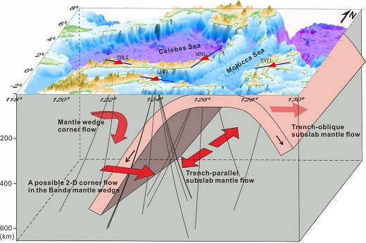 圖2 雙向俯沖的Molucca Sea板塊之上地幔楔、板下地幔以及板片邊緣地幔流動模型
