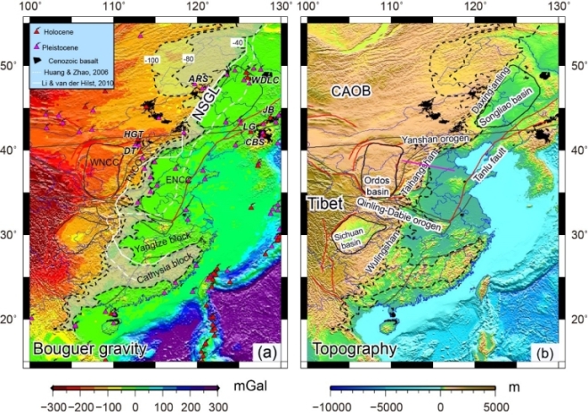 圖1. 中國(guó)東部布格重力異常和地形圖。黑色虛線所示為-100, -80, -40mGal重力等值線;白線為遠(yuǎn)震體波成像給出的地幔過(guò)渡帶停滯板片的西界