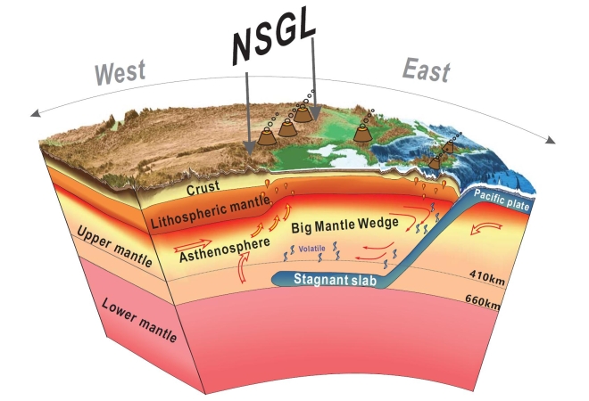 圖2. 南北重力梯度帶的形成機(jī)制示意圖。 早白堊世西太平洋板塊的后撤導(dǎo)致俯沖板片在地幔過(guò)渡帶大范圍滯留并形成大地幔楔系統(tǒng),地幔楔內(nèi)部的物質(zhì)對(duì)流和地幔過(guò)渡帶的揮發(fā)物(包括水和二氧化碳)弱化并改造上覆巖石圈,從而導(dǎo)致南北重力梯度帶的形成