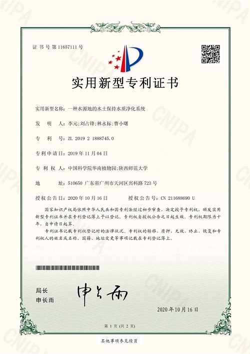 10月8日獲悉,由中科院華南植物園恢復生態(tài)學團隊(PI:劉占鋒研究員)完成的“一種水源地的水土保持水質(zhì)凈化系統(tǒng)”獲國家實用新型專利授權(quán)。