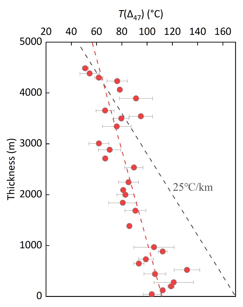 圖1 風火山群團簇同位素溫度隨地層厚度演化曲線(紅色虛線)