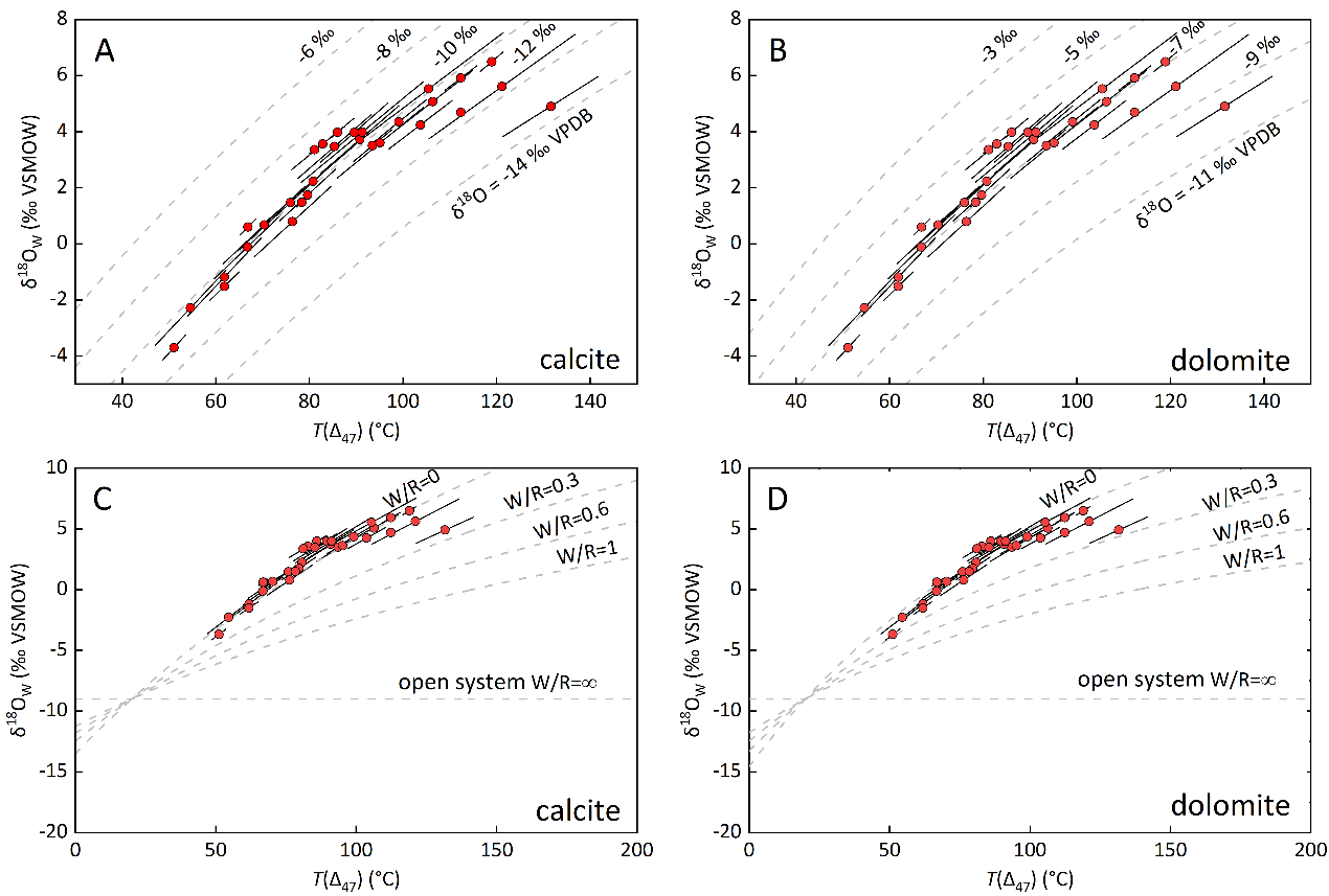 C和D:不同水巖交換模型背景下δ18OW vs TΔ47