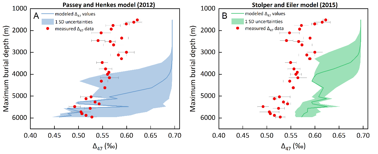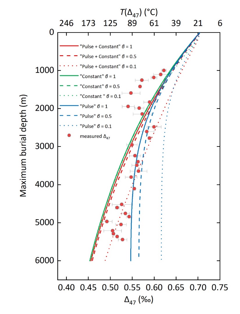 憑借碳酸鹽晶格內13C-18O鍵的豐度和其形成溫度之間的特殊相關性,碳酸鹽團簇同位素(clumped isotope,其相對豐度以Δ47值表示)已經成為一種重要的地質溫度計。然而,在實際應用中,原始的碳酸鹽Δ47組成可能會在沉積盆地的熱埋藏過程中以C-O鍵固態重排(solid-state reordering)或者碳酸鹽重結晶的方式發生改變。準確識別碳酸鹽在埋藏過程中可能發生的蝕變及類型對于正確解釋團簇同位素組成、古溫度重建以及盆地的埋藏演化歷史至關重要。盡管基于不同溫度和時間條件下的碳酸鹽加熱實驗以及熱歷史重排模型等研究為蝕變類型的識別提供了可能的途徑,但只有結合不同埋藏深度下的自然碳酸鹽樣品的研究,才能對不同時空尺度下Δ47的變化特征和沉積地層的熱埋藏和成巖歷史有更深入的認識。