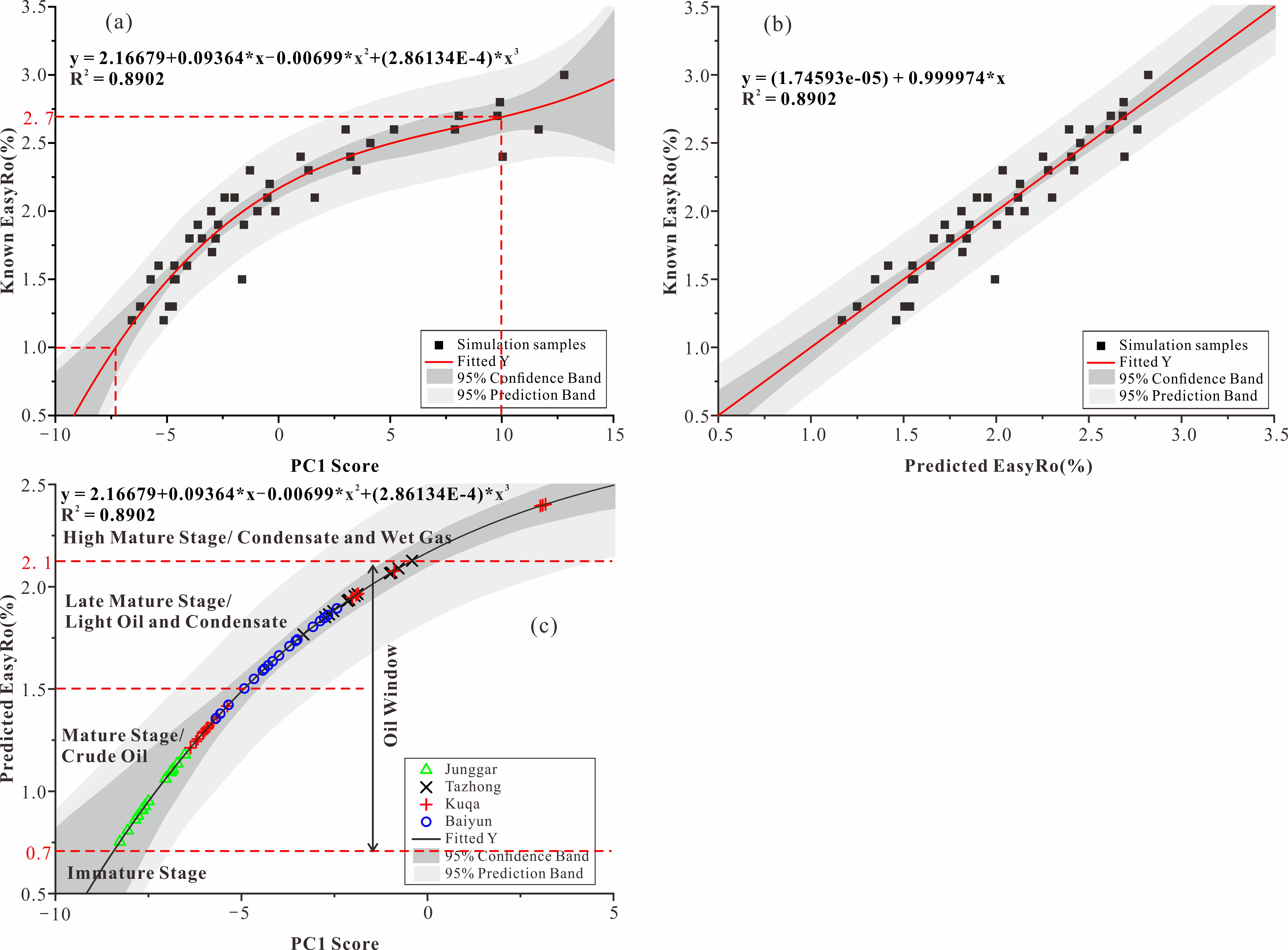 本次用于統計分析建模的金剛烷數據主要來自三種不同類型干酪根(I、II和III型)和一種原油的熱裂解模擬實驗,主要影響因素考慮了母質類型和熱成熟度,提取了包括金剛烷絕對濃度、濃度比值和異構化比值在內的50個金剛烷指標。主成分分析(PCA)結果表明:主成分PC1反映原油成熟度,PC2反映原油母質類型(圖1)。將PCA和判別分析(DA)結合,建立了金剛烷參數與原油母質類型的關系模型(圖2)。利用該模型對我國部分含油氣盆地原油母質類型的判識結果表明:準噶爾盆地中部、塔中隆起、庫車坳陷和白云凹陷的原油分別來自I - II型、I型、II - III型和II型干酪根。將PCA和回歸分析(RA)結合,建立了金剛烷參數與熱成熟度之間的定量關系模型(圖3)。利用該模型對準噶爾、塔里木等實際含油氣盆地原油成熟度的評價結果表明:準噶爾盆地中部原油成熟度最低(EasyRo = 0.8% ~ 1.2%),對應生油窗階段;塔里木盆地塔中隆起原油成熟度介于1.8% ~ 2.1%EasyRo之間,對應生油窗晚期;珠江口盆地白云凹陷原油(EasyRo = 1.4% ~ 1.9%)成熟度介于上述兩組之間;塔里木盆地庫車坳陷原油成熟度有分異,可能與庫車坳陷多期次排烴事件有關?;谝陨蟽深惻凶R模型取得的認識與前人基于其它地球化學指標的研究結論一致,初步證實了這兩類模型的應用前景和有效性。相對于個別單一的金剛烷指標,基于大量數據的統計分析的評價模型更具普適性,同時該模型對高過成熟階段輕質油/凝析油的來源與成熟度判識更具優勢。本研究有望促進金剛烷指標在含油氣盆地更為廣泛、科學的應用。