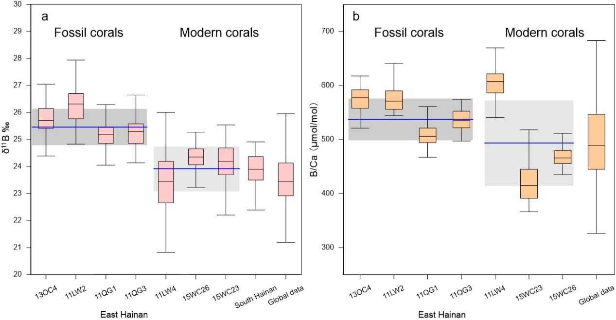 針對這一科學問題,中國科學院廣州地球化學研究所穩定同位素地球化學學科組的陳雪霏副研究員和鄧文峰研究員等人選取了海南島東部的現代濱珊瑚樣品,嘗試通過對比相同海域環境下、同期生長的珊瑚的硼同位素體系組成,來限定珊瑚δ11B和B/Ca的個體差異程度。對比結果顯示:δ11B個體間的平均差值(mean offset)最大可以達到1.05‰,而B/Ca可以達到183.1 μmol/mol,意味著珊瑚鈣化流體pHcf和DICcf均有顯著的個體差異,平均差分別可以達到0.07個pH單位和1,444 μmol/kg。這對于重建海水pH來說,最大可以導致約0.14個pH單位的偏差。在這一認識的基礎上,作者對同樣采自海南島東部的化石珊瑚也進行硼同位素體系分析,并與現代珊瑚記錄進行了對比,發現現代珊瑚δ11B顯著偏低,較化石珊瑚平均低約1.67‰,幅度超過個體差異的程度;但珊瑚B/Ca在兩者間的差別并未達到顯著性水平(圖1)。這說明,工業革命以來人類活動引起的環境脅迫,特別是海洋酸化已造成現代珊瑚鈣化流體pHcf顯著性下降,意味著珊瑚鈣化能力的減弱。但是考慮到鈣化流體DIC較大的個體差異,現代珊瑚和化石珊瑚之間的差異并不明顯,這可能說明珊瑚內部CO2系統并未受到海洋升溫和酸化的顯著影響。
