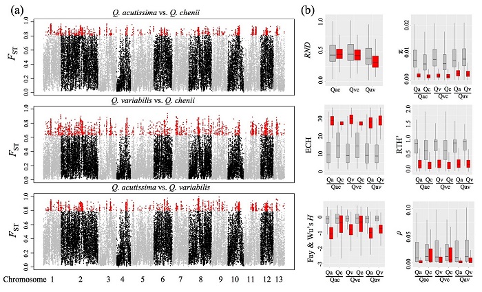 研究以我國(guó)分布的三個(gè)櫟屬物種:麻櫟(Quercus acutissima)、栓皮櫟(Quercus variabilis)和小葉櫟(Quercus chenii)為研究對(duì)象,對(duì)100多個(gè)個(gè)體進(jìn)行全基因組測(cè)序,獲得了1600多萬(wàn)個(gè)SNP位點(diǎn)。群體歷史分析發(fā)現(xiàn),這三個(gè)物種間的分化時(shí)間始于中新世(Miocene)晚期,其后各物種在更新世(Pleistocene)冰期經(jīng)歷了一系列的瓶頸效應(yīng)。通過對(duì)多個(gè)群體遺傳學(xué)參數(shù)的聯(lián)合分析,結(jié)合計(jì)算機(jī)模擬,我們證實(shí)了選擇性清除和背景選擇是導(dǎo)致基因組變異的重要力量,它們?cè)诓煌蚪M區(qū)域所起的相對(duì)作用是不同的。選擇性清除降低有利變異位點(diǎn)周圍的遺傳多樣性水平,促進(jìn)種間基因組高分化區(qū)域的產(chǎn)生;背景選擇對(duì)基因組變異的影響更為廣泛,決定了基因組的背景變異模式。