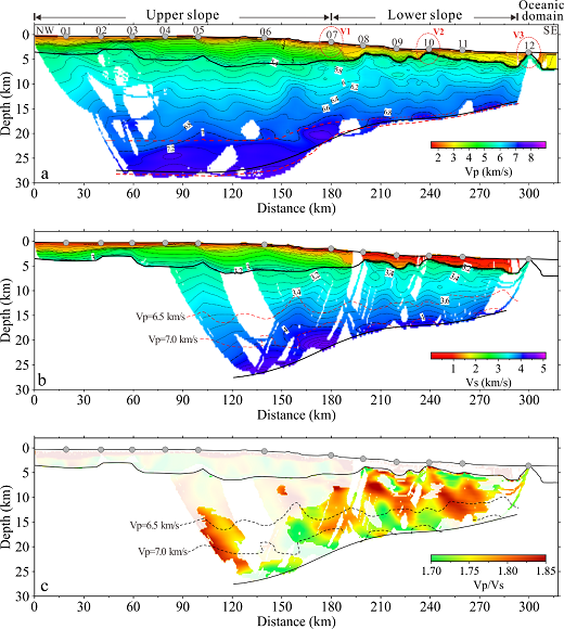 南海東北部陸緣是一個獨特的大陸邊緣,具有張裂早期巖漿作用較弱,裂后期巖漿作用強烈的特征,同時該區域地殼伸展和巖漿活動之間也存在復雜的關系。了解南海東北部巖漿活動的發育規模、物質屬性及構造模式等對于研究區域構造演化具有重要意義。從海底地震數據中獲得的波速比值(Vp/Vs)可用于揭示巖石物性,而橫波(S波)和波速比(Vp/Vs)綜合研究可以有效了解到該區地殼物質組成,因此,可以綜合研究深部地殼結構和相關巖石物性來探討區域構造和巖漿作用。