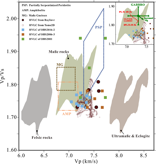 研究人員收集了東沙海域采集的OBS數據(NS5測線),運用反演方法獲取了P 波、S 波和Vp/Vs數據的結構模型。結果顯示,下地殼高速體的Vp 為 7.0–7.5 km/s ± 0.05–0.25 km/s,Vp/Vs為 1.70–1.82 ± 0.05,表明其成分以基性為主,為后期巖漿侵入形成的富鎂輝長巖。