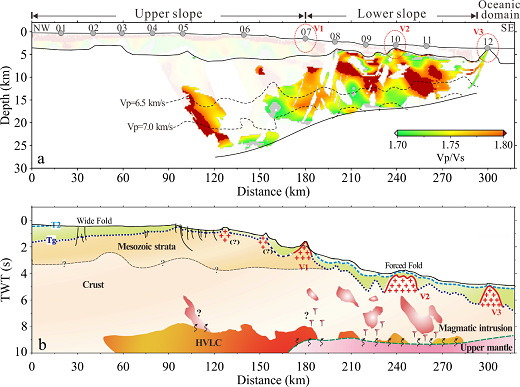 研究認為南海東北部洋-陸過渡帶地殼拉張減薄程度劇烈,形成了大量伸展性斷層,后期巖漿易沿斷裂向淺部遷移,使得深部鎂鐵質巖漿侵入程度向海增大(Vp/Vs有向海增大的趨勢),這導致下地殼高速體厚度在洋測更薄。該研究為深入認識南海北部陸緣巖漿活動及地殼伸展提供了重要信息。