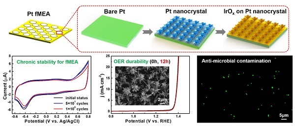圖二 氧化銥/鉑納米枝晶電極修飾流程示意圖,及其分別用于神經電極、水氧化和抗生物污染方面的性能表征