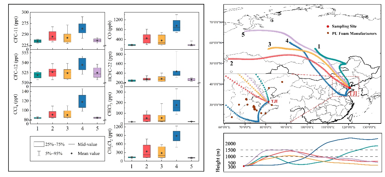 針對這一問題,中國科學院廣州地球化學研究所王新明研究員和張艷利特任研究員課題組與山東大學薛麗坤教授、中國科學院煙臺海岸帶研究所唐建輝研究員和加州大學爾灣分校Donald Blake教授合作,利用2012-2018年間在山東的三個郊區(qū)站點以及泰山頂和砣磯島兩個區(qū)域背景站點的觀測數(shù)據(jù),對CFC-11的變化趨勢和排放情況進行了評估。研究發(fā)現(xiàn),與夏威夷Mauna Loa全球背景站點相比,在山東同期測得CFC-11濃度水平要高出17-23%,但結合前期研究結果來看,2012-2018年CFC-11水平仍呈顯著下降趨勢,且下降速率(-3.8 ppt yr-1)高于全球背景站下降速率(-1.2 ppt yr-1)(圖1)。必須看到,觀測期間泰山頂和砣磯島站點后向氣團軌跡表明,經(jīng)過山東半島聚氨酯泡沫工業(yè)區(qū)氣團的CFC-11濃度明顯增加,間接說明CFC-11的“意外排放”可能與聚氨酯泡沫工業(yè)生產(chǎn)活動有關(圖2)。我們進一步基于示蹤物比值法對我國東部CFC-11排放量進行了估算,兩個站點基于一氧化碳(CO)、氯仿(CHCl3)和四氯化碳(CCl4)等示蹤物的估算結果比較一致(圖3),得出我國東部CFC-11的平均排放量14.7±4.3 Gg yr-1。這一結果低于前期國外研究估算值,且由于我們的估算是基于在排放熱點地區(qū)觀測的CFC-11與示蹤物比值來代表整個東部地區(qū),因而該排放量應是我國東部CFC-11的排放上限。