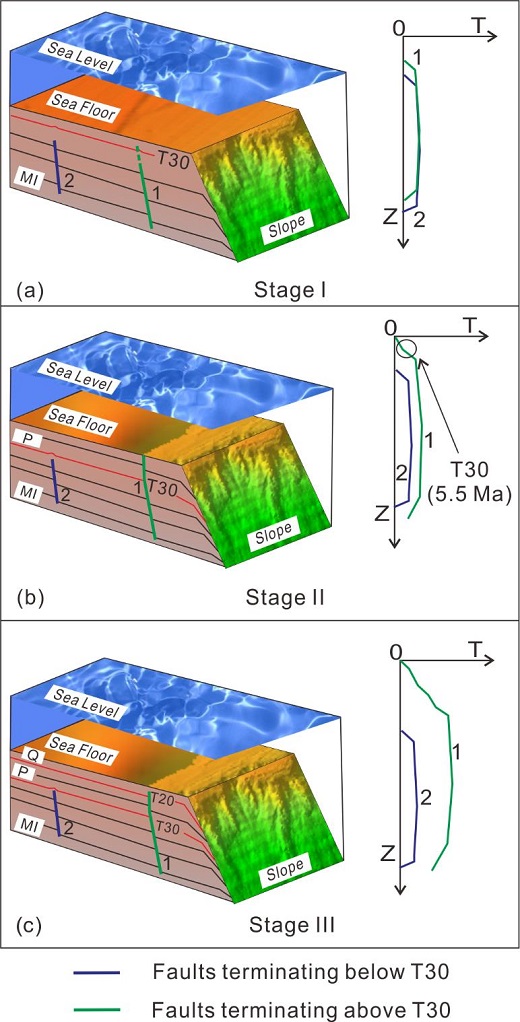 研究人員還以三維地震反射數據體為基礎,精細化分析了該區域的正斷層系統。研究人員選擇三條穿過上新世地層底部的大型斷層和三條終止于上中新統的斷層為主要研究對象,利用Throw-depth plots(斷層落差圖示法)量化分析斷層落差分布,并結合斷層頂部地層的幾何形狀特征,判別研究區斷層屬于生長斷層或盲斷層(即斷端線未達地表)。結果顯示南海西北部大陸架上停止活動于中新統的正斷層為盲斷層,而穿過上新世地層底部的正斷層,其下部表現出盲斷層特征,上部呈現生長斷層的再活動性。