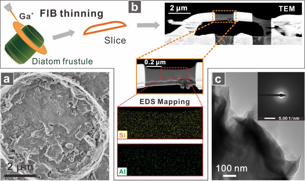 圖1. 硅藻-粘土(黏土)礦物相互作用產物的微結構(展示了硅藻對粘土礦物的微生物溶解作用及其對粘土礦物結構鋁的吸收;詳見論文原文)