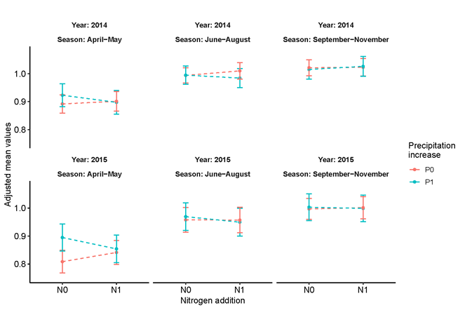 圖1. 氮添加和降雨量增加的季節交互效應。