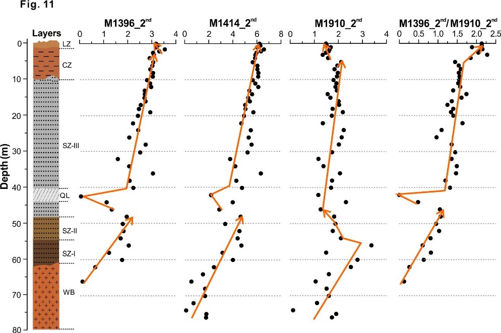 圖2 仁居稀土礦床剖面中指示粘土礦物中種類和含量的光譜參數