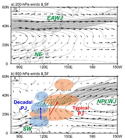 圖2 藍色陰影代表年代際PJ 波列,橙色陰影代表年際PJ 波列。SW、NPLWJ代表氣候態風場。綠色斜杠代表夏季梅雨帶。