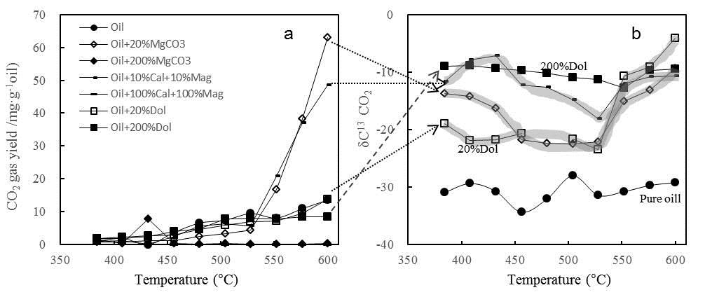 圖1. a.加入不同濃度和種類的碳酸鹽巖礦物后原油裂解的CO2產率隨溫度變化關系圖;b. 原油裂解產物中CO2的δ13C值隨溫度變化關系圖.