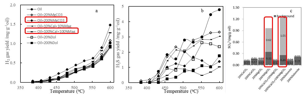 圖2. a.加入不同濃度和種類的碳酸鹽巖礦物后原油裂解的H2產率隨溫度變化關系圖;b. H2S產率隨溫度變化關系圖; c. 600oC熱解產物中硫酸根離子絕對濃度.