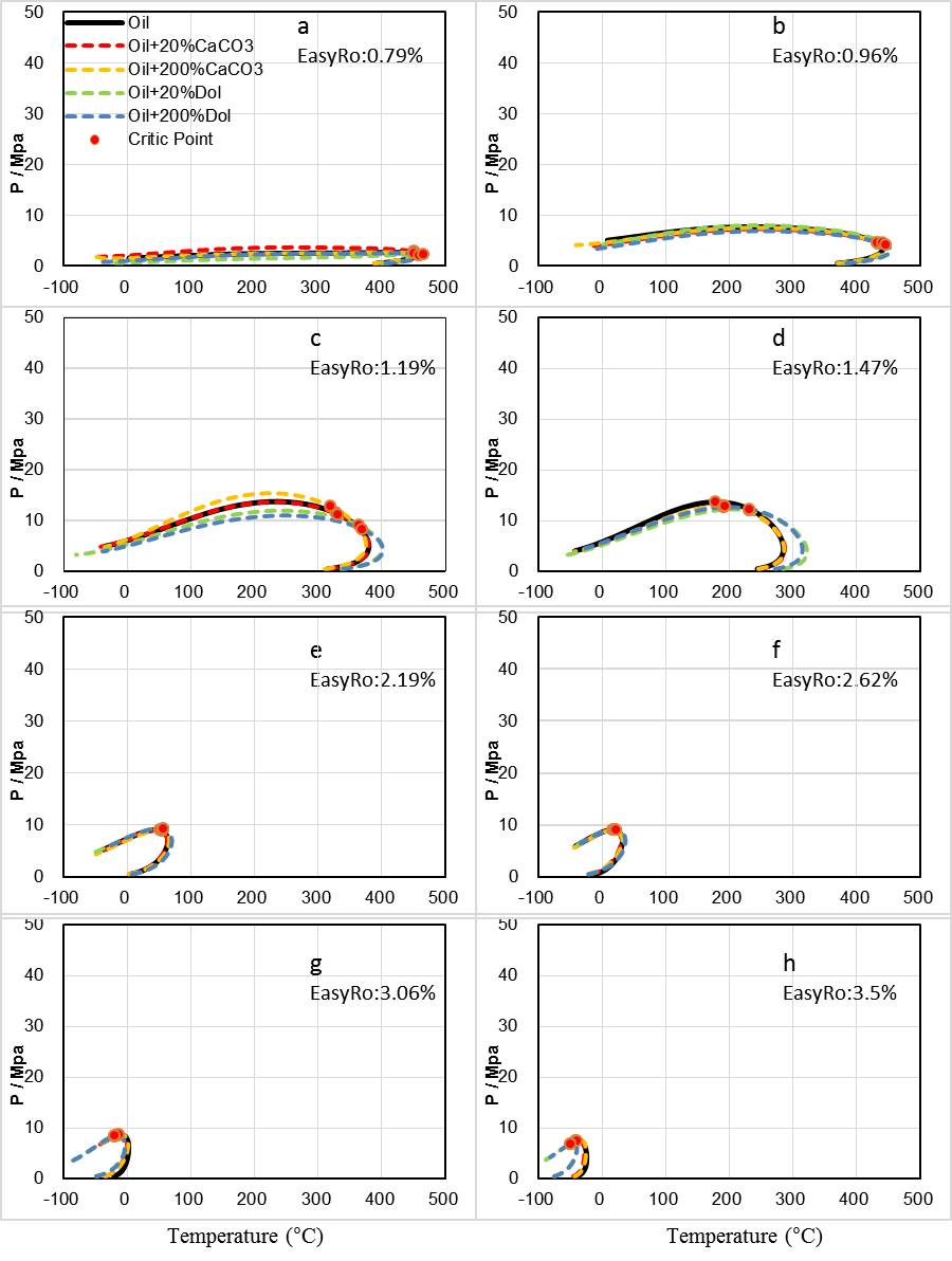 PVT相態模擬結果表明,白云石對原油裂解行為的影響在Easy Ro 為1.19-1.47%這個階段最為強烈,特別是在Easy Ro為1.47%時,白云石的存在會導致原油的露點溫度增加約35℃且泡點壓力下降約1.3MPa(圖3)。一般而言,成熟度在1.3-2.0%階段為輕質油/凝析油生成高峰。因此對于賦存于白云巖儲層中的凝析油/輕質油氣藏而言,考慮白云石的影響將有助于更準確地預測儲層中油氣的組成和相態。