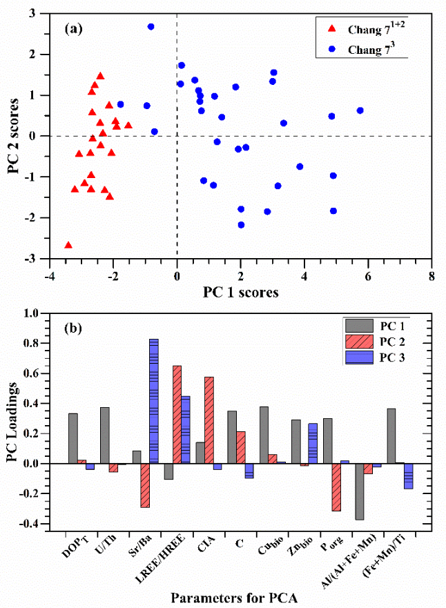 圖1 PCA結(jié)果:(a)長(zhǎng)7段泥頁(yè)巖PC1與PC2因子得分分布;(b)前三個(gè)主成分對(duì)11個(gè)地球化學(xué)參數(shù)的載荷分布
