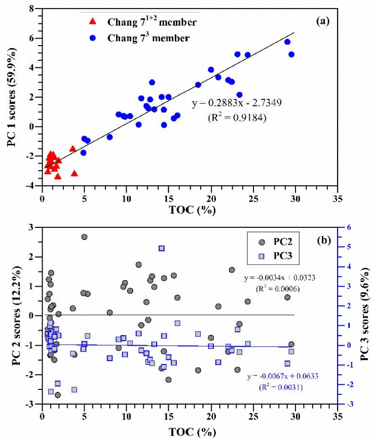 鄂爾多斯盆地三疊系延長(zhǎng)組長(zhǎng)7段湖相高有機(jī)質(zhì)黑色泥頁(yè)巖是盆地內(nèi)中生代油氣資源的主要烴源巖,也蘊(yùn)含有豐富的頁(yè)巖油氣。中國(guó)科學(xué)院廣州地球化學(xué)研究所有機(jī)地球化學(xué)國(guó)家重點(diǎn)實(shí)驗(yàn)室、深地科學(xué)卓越創(chuàng)新中心鄒艷榮研究員和博士研究生石軍等將PCA與元素地球化學(xué)相結(jié)合研究鄂爾多斯盆地東南部延長(zhǎng)組長(zhǎng)7三段泥頁(yè)巖中有機(jī)質(zhì)富集因素。在對(duì)研究區(qū)樣品沉積古環(huán)境重建(氧化還原狀態(tài)、古鹽度、沉積速率等)和古生產(chǎn)力評(píng)價(jià)(古氣候、生產(chǎn)力、事件沉積等)的基礎(chǔ)上,對(duì)由主、微量和稀土元素地球化學(xué)參數(shù)組成的數(shù)據(jù)集進(jìn)行主成分分析,發(fā)現(xiàn)前三個(gè)主成分(PC1,PC2和PC3)總載荷可達(dá)到81.7%,其中PC1與反映古生產(chǎn)力和氧化還原環(huán)境的參數(shù)相關(guān)(如Cubio,Porg和U/Th,DOPT等);而PC2和PC3分別主要與指示沉積速率和水體鹽度的參數(shù)相關(guān)(圖1)。前三個(gè)主成分與泥頁(yè)巖樣品總有機(jī)碳(TOC)顯示,PC1與TOC有很好的相關(guān)性,R2達(dá)到0.92;而PC2和PC3與TOC的相關(guān)性差,R2小于0.01(圖2),表明控制研究區(qū)有機(jī)質(zhì)富集的主要因素是古生產(chǎn)力和沉積水體的氧化還原狀態(tài),即由原始生產(chǎn)力模式和有機(jī)質(zhì)保存模式共同主導(dǎo)鄂爾多斯盆地延長(zhǎng)組長(zhǎng)7段地層有機(jī)質(zhì)富集。