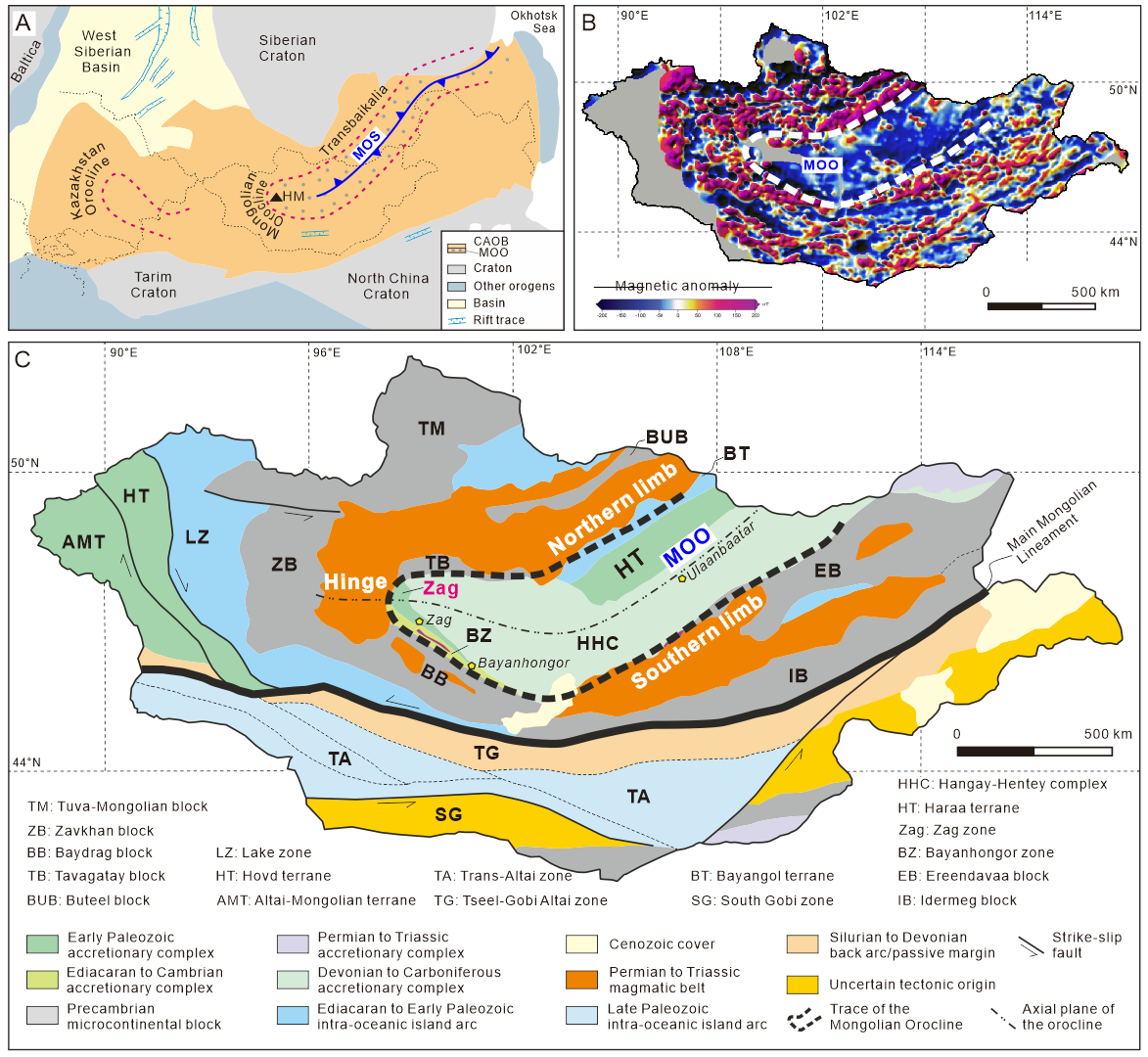 圖1. 蒙古山彎構造及鄰區大地構造簡圖(A, C)及航磁圖(B)。MOS: 蒙古鄂霍茨克縫合帶;MOO: 蒙古鄂霍茨克造山帶。