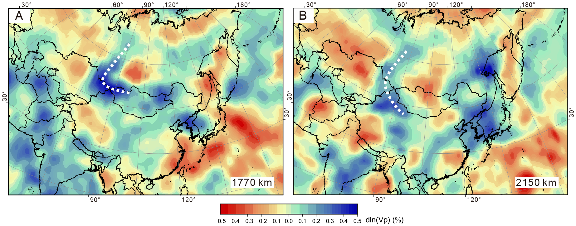 圖3. 亞洲地區下地幔地震層析成像圖。白色虛線刻畫了殘留在下地幔中的蒙古鄂霍茨克俯沖板片(高速體)延伸方向,其在1770公里深處(A)較2150公里深處(B)更為彎曲,指示蒙古山彎構造兩翼俯沖體系向海溝方向的逐漸后退。