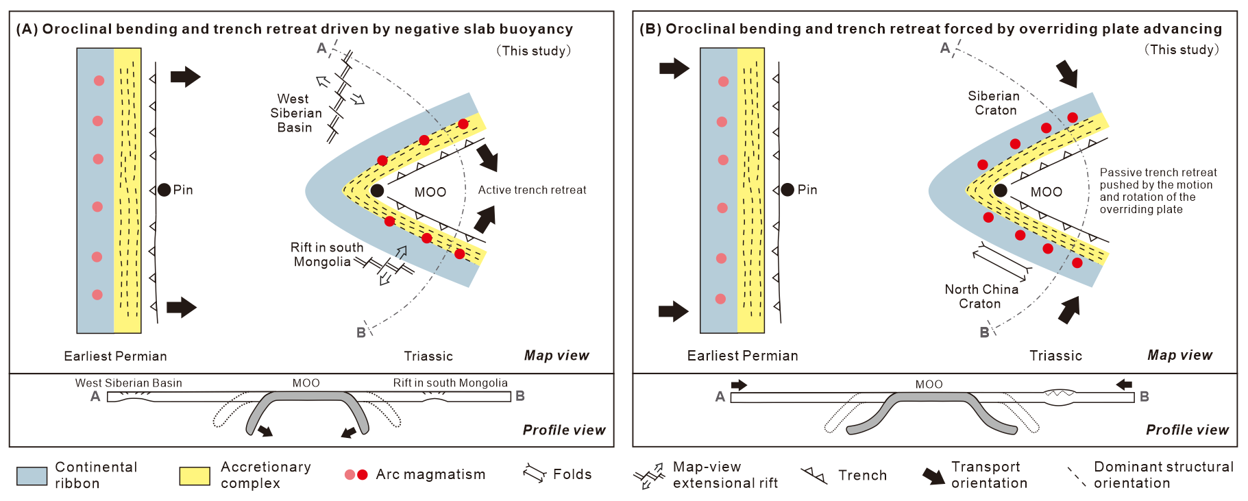 圖4. 蒙古山彎構造形成的兩種端元模式簡圖。(A)蒙古鄂霍茨克洋俯沖板片沿著走向差異后撤(兩翼較快),導致俯沖帶彎曲及山彎構造形成,同時伴隨著弧后裂谷盆地的打開;(B)西伯利亞和華北相向旋轉,迫使俯沖帶后退及山彎構造形成,對應著上覆板塊的壓縮變形。