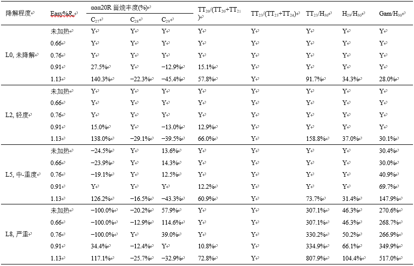 備注:百分比指熱解后原油相對于未降解油的初始值變動的幅度;標記“Y”說明與未降解油的初始值相比其變動小于 10%,為蝕變后仍舊可用的指標。
