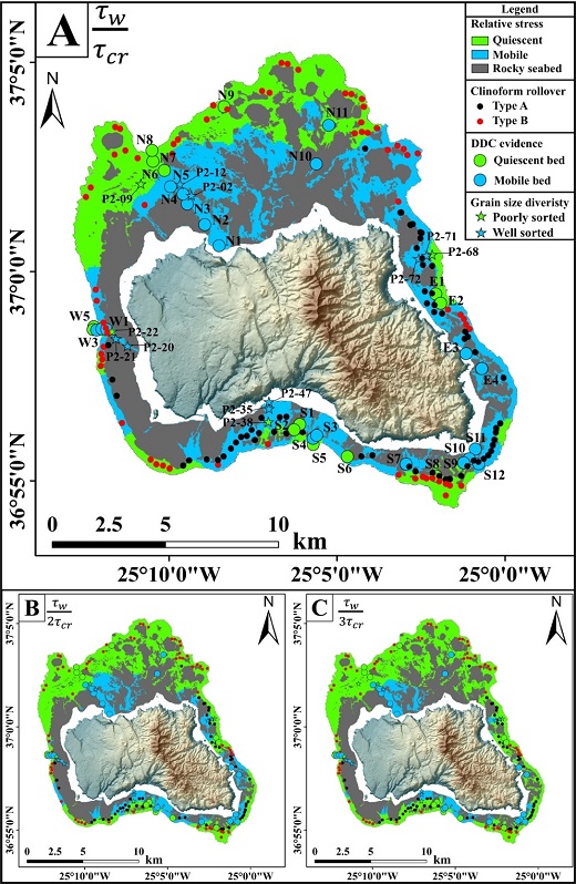 研究人員以葡屬亞索爾群島內的圣瑪利亞海島(Santa Maria Island, Azores)為研究對象,利用采集于海島陸架區112個站位的表層碳酸鹽沉積物樣品,和該區域高分辨率風浪場特征,基于傳統公式數值模擬極端風浪在海底產生的剪應力強度與沉積物沉積閥值之間的對應關系。結果顯示,近乎整個海島陸架區都的沉積物都應該在極端風浪的作用下侵蝕向深海搬運。然而這與研究人員在海島陸架區獲得的地球物理、海底地貌和海洋沉積學三種觀測證據完全相悖。