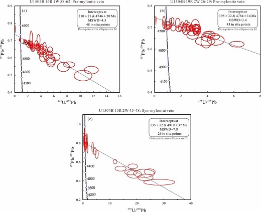 研究團(tuán)隊(duì)對(duì)基底綠片巖相糜棱巖開(kāi)展了詳細(xì)的顯微構(gòu)造研究,結(jié)果表明綠片巖相糜棱巖經(jīng)歷了早期韌性變形和晚期脆性變形兩階段的拉伸作用。同時(shí),根據(jù)與糜棱面理的交切關(guān)系,識(shí)別出糜棱變形前、同糜棱變形和糜棱變形后碳酸鹽脈。碳酸鹽脈U-Pb定年和δ13C、δ18O、87Sr/86Sr分析表明:糜棱變形前碳酸鹽脈年齡為210 ± 20和195 ± 32 Ma;同糜棱變形碳酸鹽脈的年齡為135 ± 12 Ma(早白堊世);糜棱變形后碳酸鹽脈體形成于始新世或更晚。將顯微構(gòu)造和碳酸鹽脈體年齡相結(jié)合,研究得出早期韌性變形代表了早白堊世的伸展事件,而晚期脆性伸展變形與新生代被動(dòng)陸緣伸展相對(duì)應(yīng)。