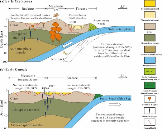 結(jié)合地質(zhì)背景,研究人員認(rèn)為南海陸緣基底在擴(kuò)張前至少經(jīng)歷了兩個(gè)伸展階段: 第一階段發(fā)生在早白堊世,由古太平洋板塊的后撤引起; 第二次發(fā)生在早新生代,為被動(dòng)裂谷作用。活動(dòng)大陸邊緣和被動(dòng)大陸邊緣的多次伸展事件共同導(dǎo)致南海陸緣減薄。