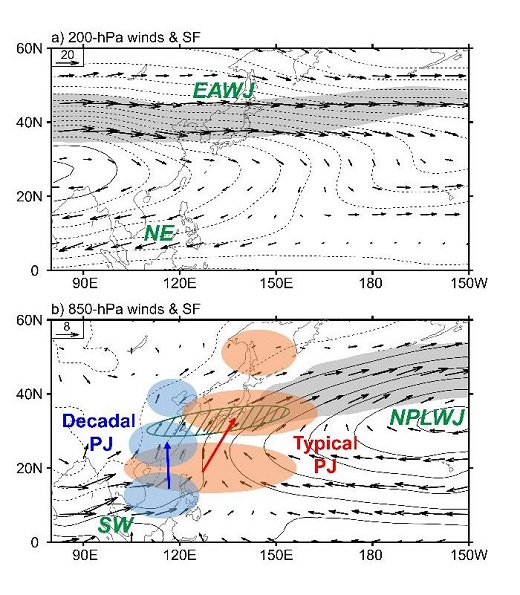 圖2 藍色陰影代表年代際PJ 波列,橙色陰影代表年際PJ 波列。SW、NPLWJ代表氣候態風場。綠色斜杠代表夏季梅雨帶。