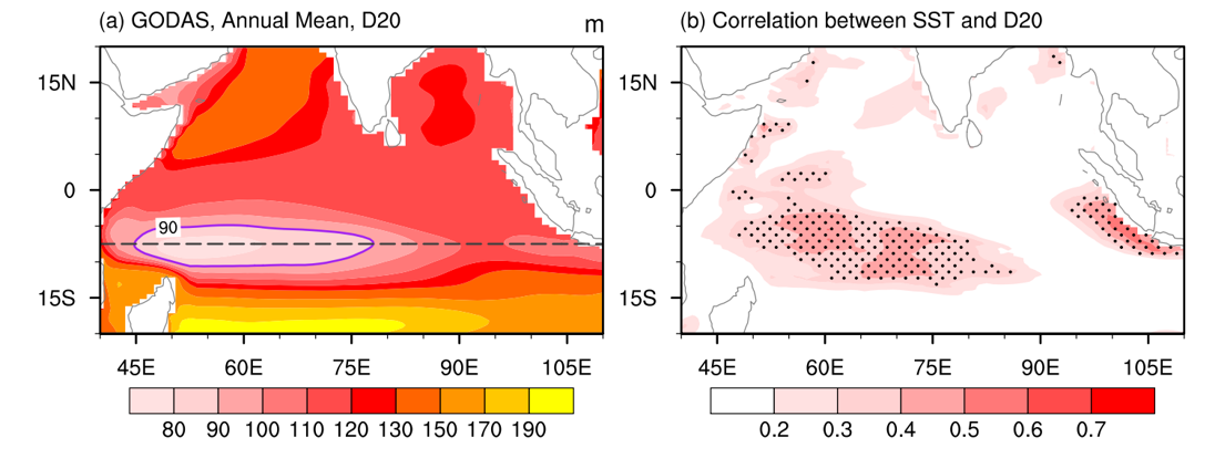 圖1 (a)為熱帶印度洋溫躍層的年平均深度;(b)為逐月海溫與逐月溫躍層深度在年際尺度上的相關(guān),圖(a)紫色線所圍區(qū)域?yàn)闇剀S層比較淺的區(qū)域,圖(b)打點(diǎn)區(qū)域表示相關(guān)系數(shù)通過(guò)95%的顯著性檢驗(yàn)