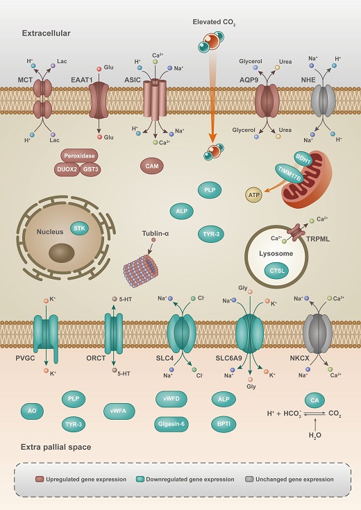 圖2 鱗硨磲對海洋酸化的胞內(nèi)適應(yīng)性反應(yīng)示意圖