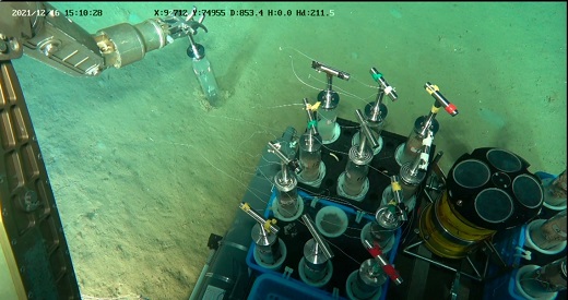 圖2. 利用機械臂對海底不穩定區淺層沉積物進行柱狀取樣。