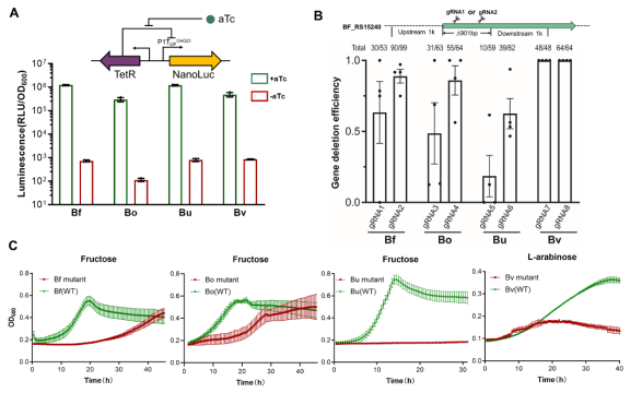 除此之外,該系統也可以在卵形擬桿菌(Bo),脆弱擬桿菌(Bf),普通擬桿菌(Bv),和單形擬桿菌(Bu)實現高效率的基因刪除。(如圖4所示)