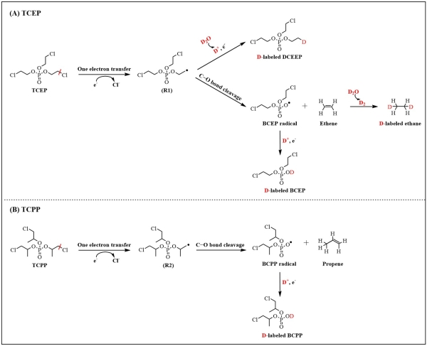 圖1. 重水體系下TCEP轉化為乙烯/BCEP(A)和TCPP轉化為丙烯/BCPP(B)的機制示意圖