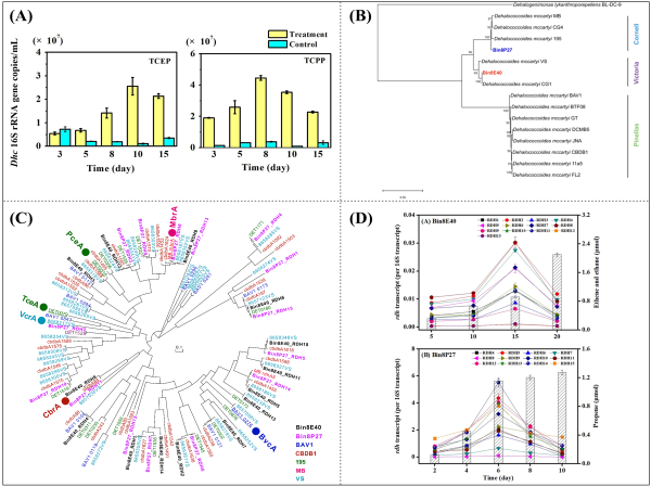 圖2. TCEP/TCPP轉化過程中Dehalococcoides豐度變化特征(A);Bin8E40和Bin8P27與參考Dehalococcoides mccartyi全基因組的最大相似系統發育樹(B);Bin8E40和Bin8P27與參考Dehalococcoides mccartyi的基因組中注釋的還原性脫鹵酶的最大相似系統發育樹(C);Bin8E40和Bin8P27 rdh基因的轉錄表達(D)