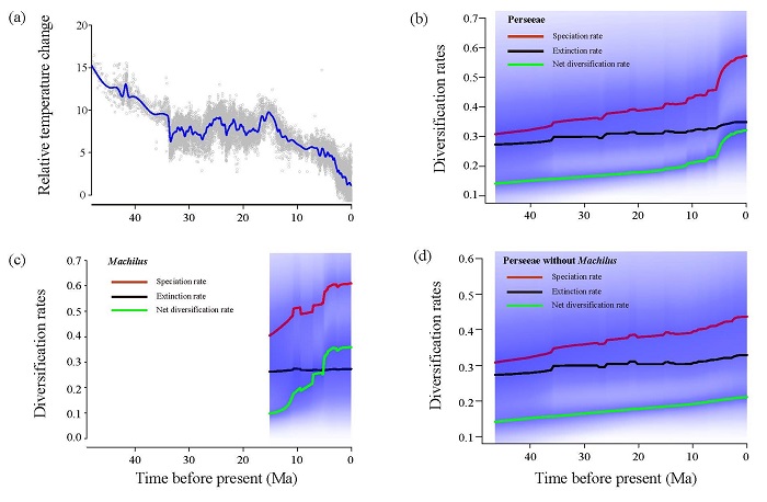 (c)潤楠屬分化速率隨時間變化。(d)鱷梨族除潤楠屬外其它類群的分化速率隨時間變化。