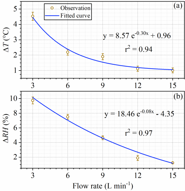 為更準確測定植物在正常生長條件下BVOCs排放因子,中國科學院廣州地球化學研究所王新明研究員和張艷利研究員課題組設計了一種用于測量植物排放BVOCs的半開放式動態箱系統(圖1)。并利用在線和離線手段,實驗室和外場觀測相結合,評估了主要的BVOCs化合物,比如:異戊二烯、單萜烯和倍半萜烯等通過箱體時的傳遞效率,發現較高流速(較短滯留時間)不僅能縮短到達穩態的時間,也能減小BVOCs的吸附損失,但分子量較大的化合物即使在高流速條件下的損失也超過30 %;從0-100%濕度下的模擬實驗表明,濕度對BVOCs的吸附損失影響不顯著(圖2),但不同化合物呈現不同特征;通過野外實測箱體內-外環境因子的差異,發現高流速有利于減小箱體內-外的溫、濕度差異(圖3)。該研究也表明,即使可以優化條件盡量減少測量時吸附損失和對植物枝葉正常生理的干擾,分子量較大的單萜烯和倍半萜烯的吸附損失依然不可忽視,可能會造成其排放因子的顯著低估,由于單萜烯和倍半萜烯同分異構體眾多,如何評估并校正其在動態箱測量過程中的損失,是需要進一步解決的問題。